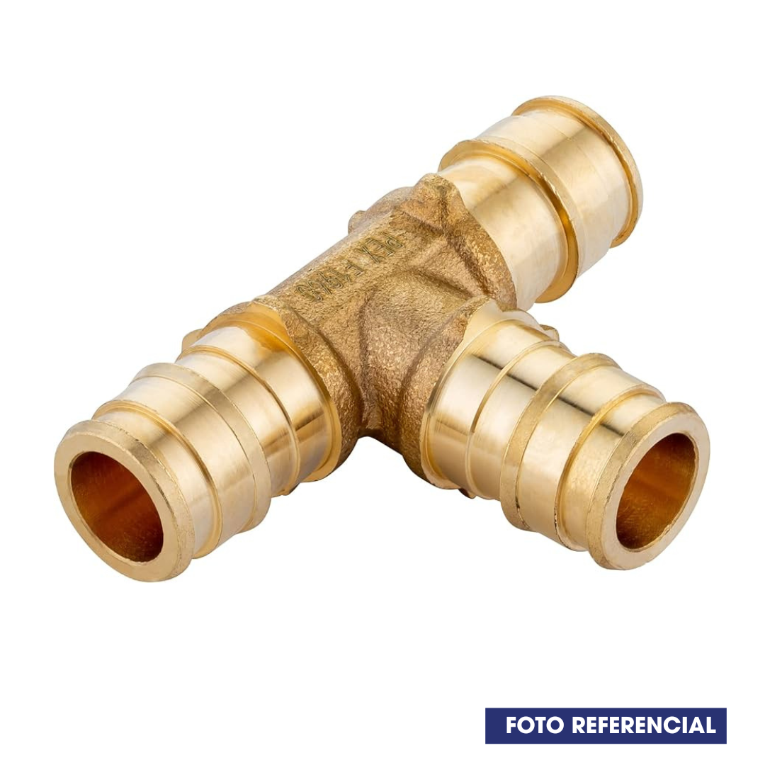 Fabricada en latón resistente a la corrosión, esta Tee ofrece una unión firme y duradera entre tuberías de distintos diámetros sin necesidad de soldadura. La instalación se realiza mediante herramientas de crimpado o press compatibles con sistemas PEX, proporcionando una solución rápida y confiable.